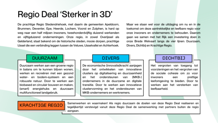 De regio Stedendriehoek heeft enorm veel te bieden. Stad en natuur zijn altijd dichtbij, je vindt er historie en innovatie, een dynamische economie met aandacht voor duurzaamheid en ruimte voor ontmoeting en ontwikkeling. Die diversiteit en kracht van de regio kwam duidelijk naar voren tijdens het Regio Deal Festival op 19 september. Hier werd duidelijk hoe we – samen met het Rijk – investeren in de brede welvaart van onze prachtige regio. Want ook in de toekomst gaan we voor een aantrekkelijke en leefbare regio voor onze inwoners en ondernemers. Is dat een uitdaging? Zeker. Maar sámen kunnen we veel en zetten we stappen naar ‘Sterker in 3D’.